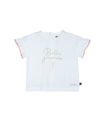 • White T-shirt with flowers and text pattern - flounces on shorts sleeves - back opening by snaps