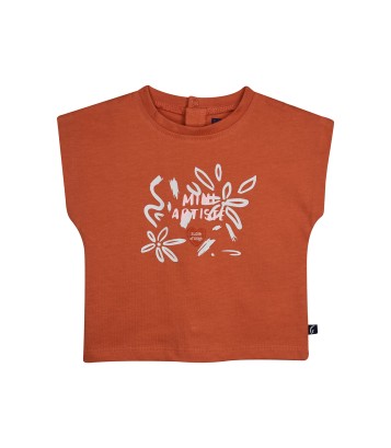 • Orange t-shirt printed with flowers and spots + text - back opening by snaps