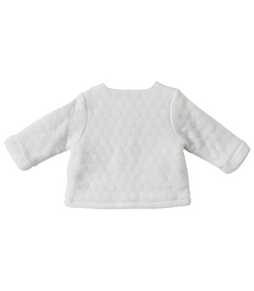 Sucre d'Orge baby ecru cardigan BARTHA 100% cotton with inside wad 100% polyester. Front opening by snaps. 2 false pockets. Embroidery. Exist from 3 to 24 months.