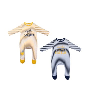 • For the white/navy color, there is an illustration of the text ""interdit de me réveiller""; for the white/yellow color, there is an illustration of the text ""interdit de me chatouiller"".
